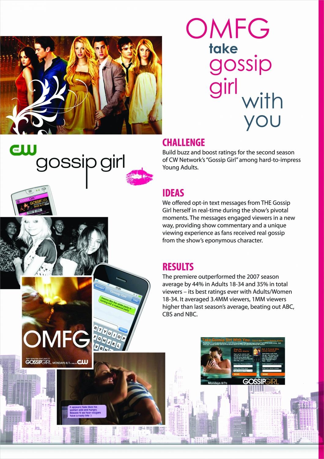 | To the fans (women 18-34) of The CW Network’s popular Gossip Girl, it’s not just a show, it’s a lifestyle. Characters’ clothes become fashion must-haves and hip texting lingo like ‘OMG!’ is incorporated into everyday vernacular. We needed to continue the buzz for the show’s second season among the hard-to-impress Young Adults, pushing the envelope to achieve more cultural permeation and ratings success. Our goals were to drive viewership by 20% over 2007, raise awareness from last season’s average of 2.3 million viewers and allow viewers to interact with the endemic qualities of Gossip Girl in a new and enticing way. We capitalized on the loyal following to the trendsetting Gossip Girl, bringing fans closer than they ever dreamt possible to the show’s characters. There was only one communication method sure to generate instant response and buzz: cellphones. Our media-first mobile idea engaged the audience and drove live-interaction during the show. |